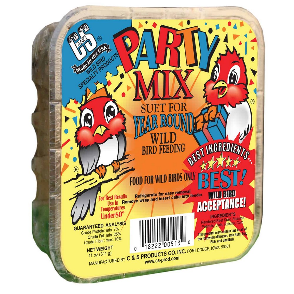 Party Mix Suet is made with a variety of seeds, nuts and fruit which puts it in the category to have the BEST wild bird acceptance year round. Ingredients: Rendered Beef Suet, Roasted Peanuts, Oats, Raisins, Corn, and Milk. Additional freight applies when shipped. (must order in 8's)