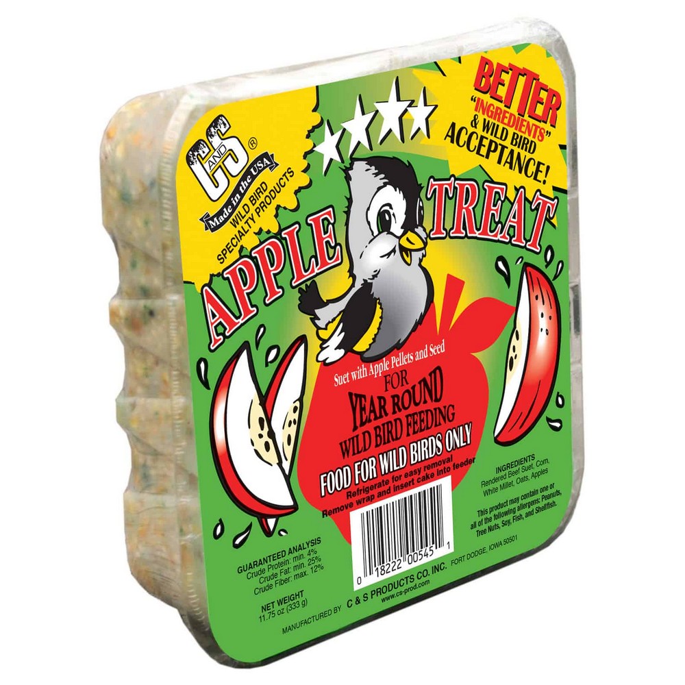 Apple Treat Suet has added apple dices and apple flavoring to the ingredients to attract the BETTER varieties of wild birds during your year round wild bird feeding. Ingredients: Rendered Beef Suet, Corn, White Millet, Oats, Milk, Apples, Yellow 5, and Blue 1. Additional freight applies when shipped.