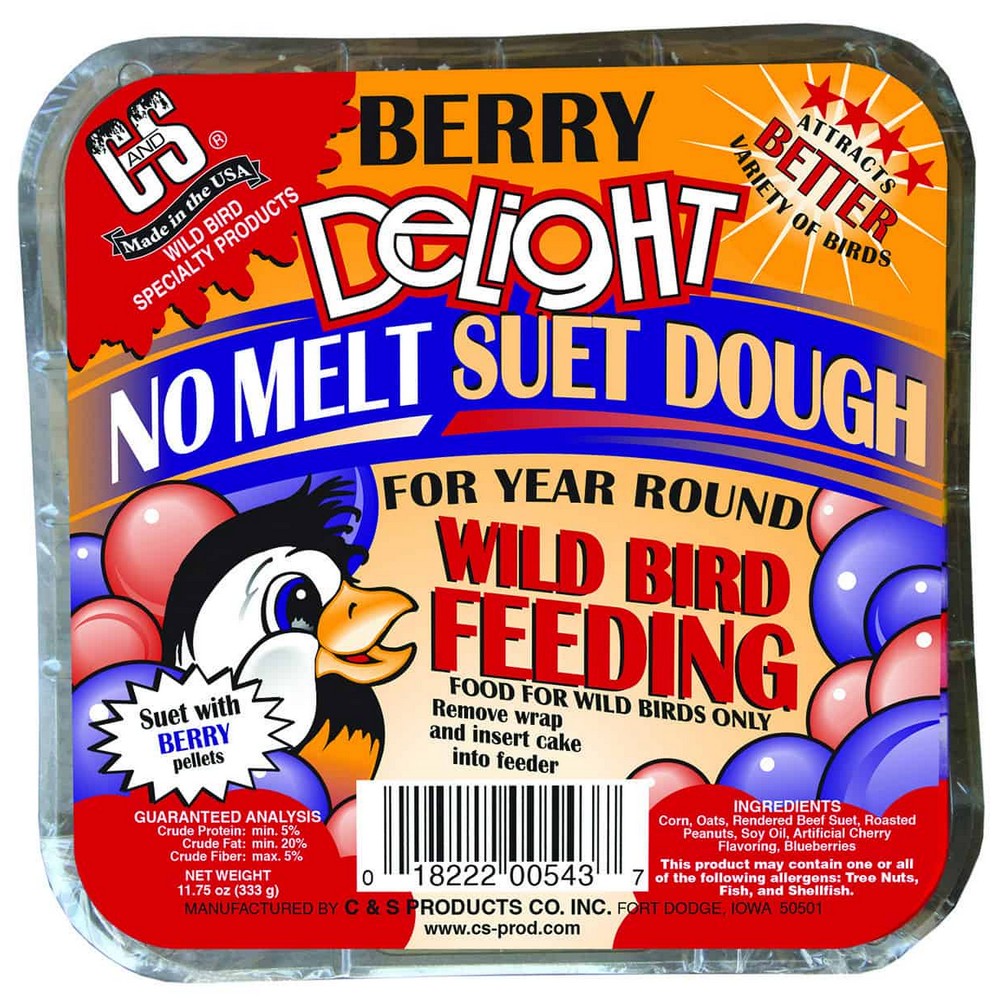 Berry Delight No Melt Suet Dough attracts a BETTER variety of birds. Ingredients: Rendered Beef Suet, Corn, Roasted Peanuts, Oats, Soy Oil, Milk, Artificial Cherry Flavoring, Blueberries, Red 40, and Blue 1. Additional freight applies when shipped. (must order in 8's)