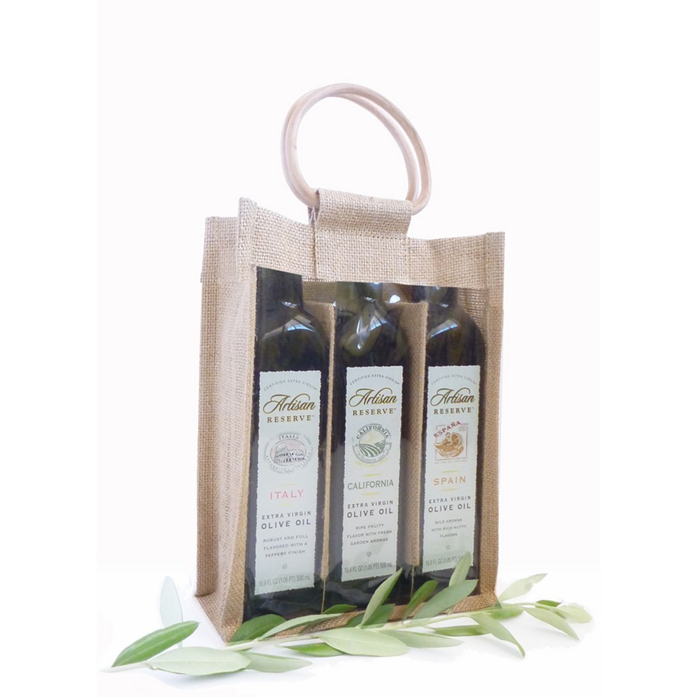 Olive oil gift bags designed to accommodate your olive oils, vinegars and much more. These attractive three bottle natural jute bags have a window to show off your gift. These bags are durable, eco friendly, sustainable and reusable. Patent Pending. Eco Friendly.