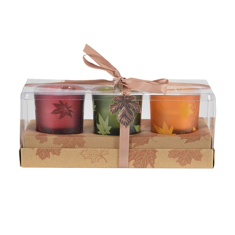 DescriptionReviews Description Set of three frosted glass votives with fall leaves designs includes 3 LED tea lights. Craft tray packaging wiith a pretty ribbon and leaf charm. Reviews Be the first to review this item There are no reviews yet Product tags Autumn 659