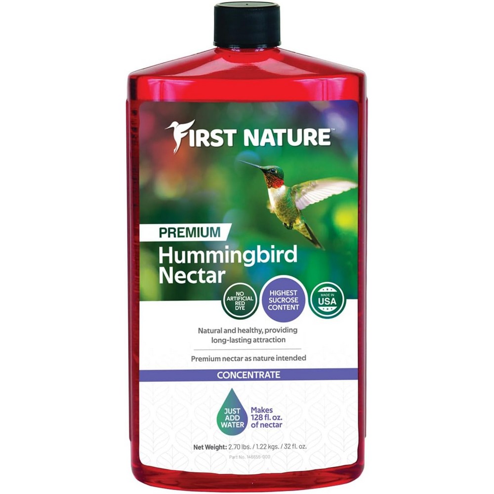First Nature Red Hummingbird Nectar, 32 ounce Concentrate. A Special Solution of the Perfect Hummingbird Sugars, easy to use. Just add water. Simply amazing results. First Nature is a premium concentrate that ends the mess of feeding hummingbirds. No granulated sugars or dry mixes to spill, no boiling water, no sticky cleanup. Really draws the birds in. Just mix one part First Nature Concentrate to three parts water. The 32 oz concentrate bottle makes a full gallon of nectar. Scientific studies have repeatedly shown that hummingbirds prefer sucrose to the monosaccharides glucose or fructose. Knowing this, First Nature Nectar uses the finest food-grade sucrose and not less effective invert sugars found in other products.