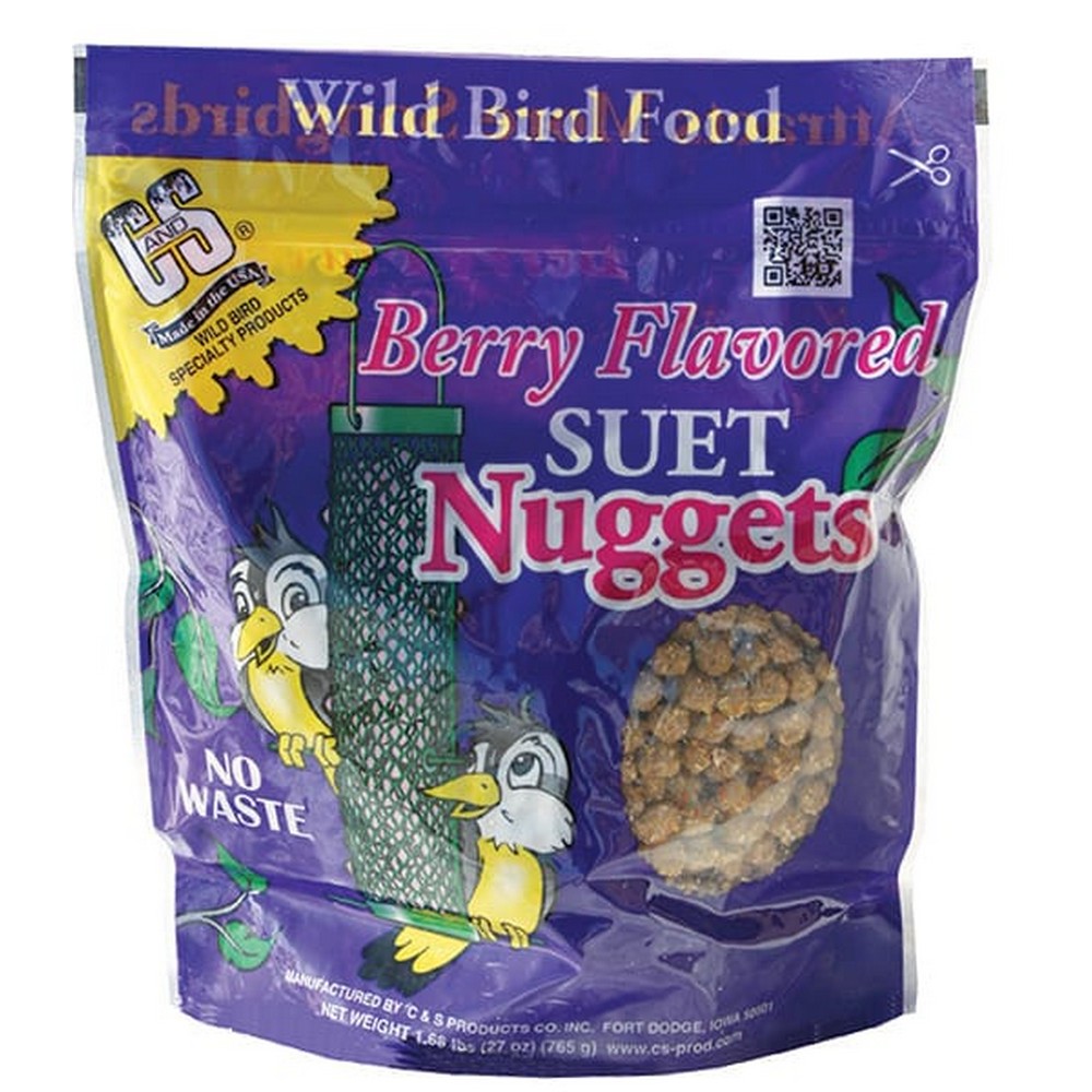 Corn, Roasted Peanuts, Rendered Beef Suet, Oats, Soy Oil, Artificial Cherry Flavoring, Blueberries, Red 40. Can be fed alone on a platform feeder or Nugget / Peanut feeder. Ideal when mixed with 5-10 lbs. of seed in a traditional feeder. Resealable bag. (must order in 4's)