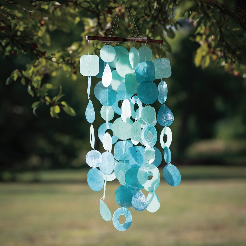 Our handcrafted capiz windchimes are made by Balinese artisans. Hand strung and hand dyed, these chimes are made of natural, renewable materials. When touched by the wind, your chime will produce a delicate tinkling musical sound.