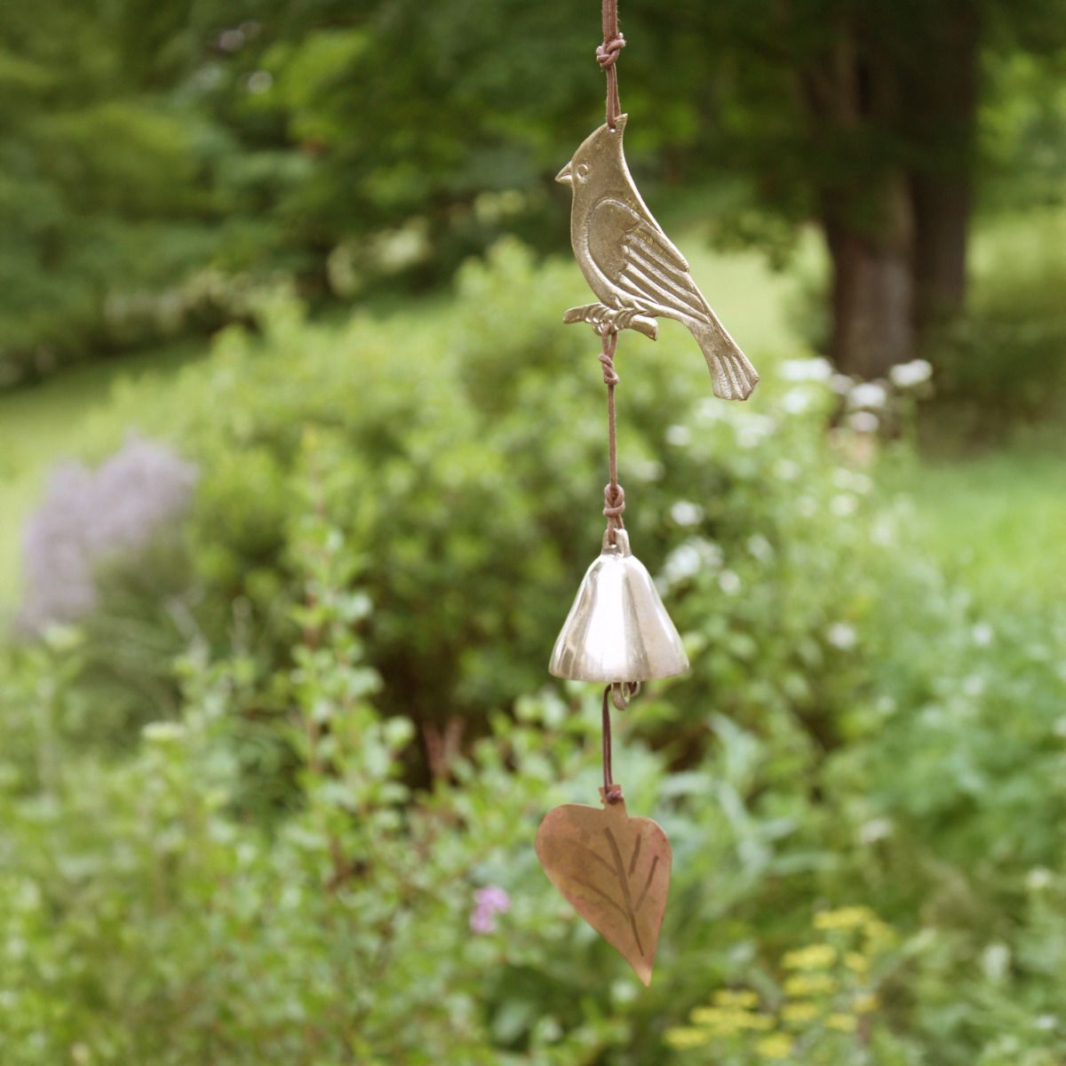 A solid Brass cardinal perches above one of our hand cast Himalayan bells. A bodhi leaf windcatcher dangles below, a traditional symbol of the infinite wisdom of Buddha nature. This unique and lovely chime makes a wonderful accent to the garden and porch areas. Made exclusively for dZi by the Tibetan colony of Lingtsang in northern India, these handsome Tibetan bells and chimes are individually sand-cast in solid Brass and carefully hand-tuned to ensure clarity of sound and tone.