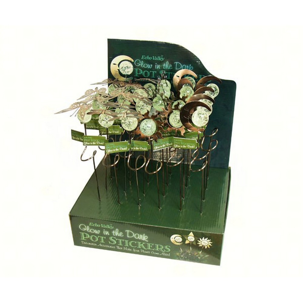 Introducing the NEW hybrid 24pc Celestial Garden Critter Pot Sticker Display Assortment which includes the ever so popular sun, moon, butterfly and dragonfly from the longstanding 4217 & 4219 pot sticker Assortments. The pot stickers will add charm, color and illumination to any interior or exterior potted plant, container or hanging basket. Luminescent crystals inside the 1.5 inch glass marble absorb light energy during the day and release it at dusk in the form of a soft green glow. Glow duration may last up to 2-4 hours, gradually fading over that time. All metal parts have an electroplated antique copper finish applied providing protection from the elements. Pot Stickers can also be used as a support for young starter plants and saplings. 1pc sun, 1pc moon, 1pc butterfly and 1pc dragonfly.