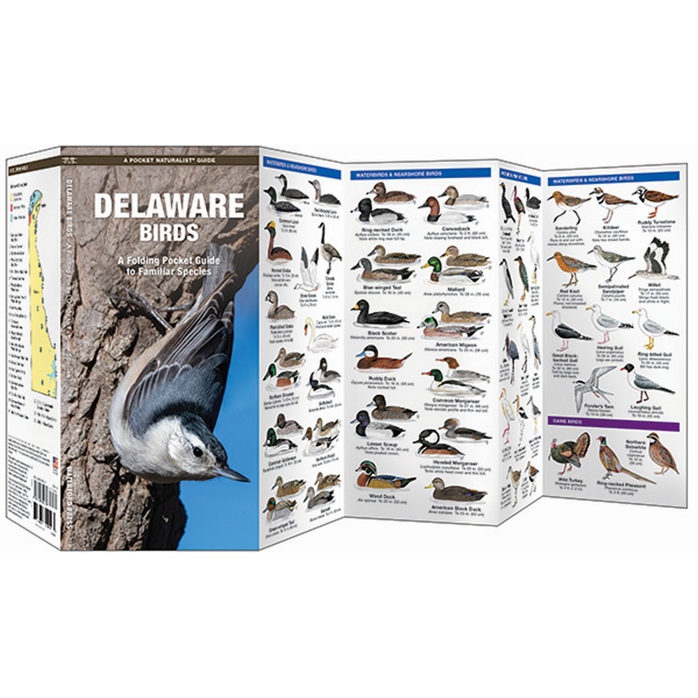 Delaware Birds is a is a pocket reference guide printed on laminate material and folded for easy storage and retrieval. Color illustrations of common bird species and an inset map of popular Delaware bird sanctuaries, helps to make this a must-have companion.