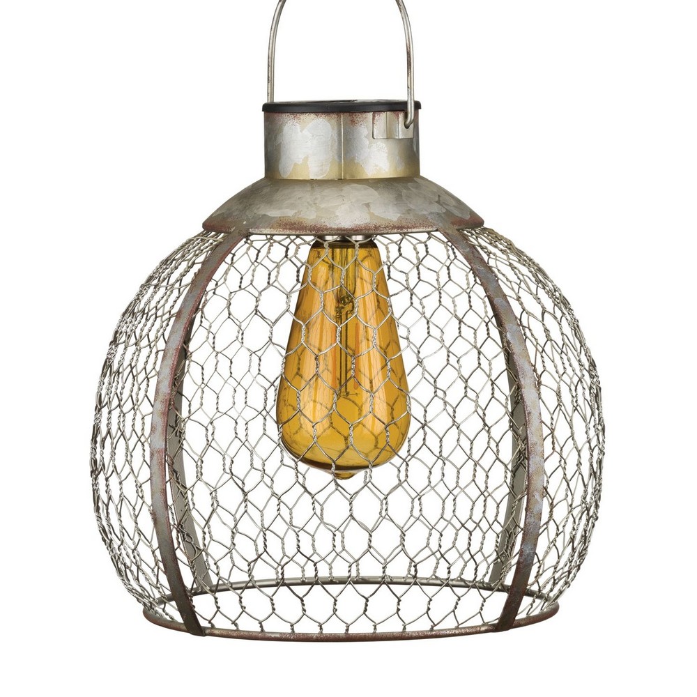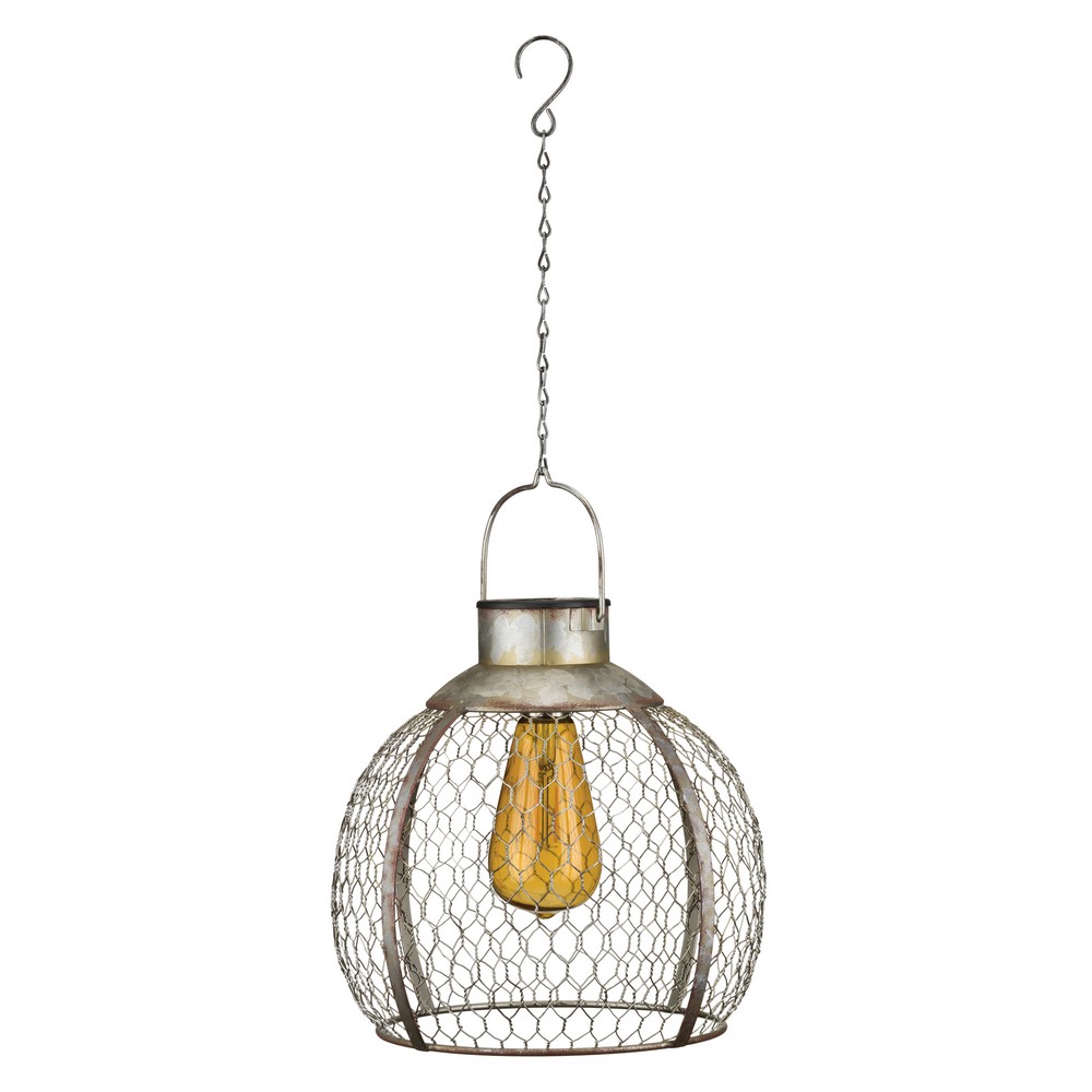 This lantern combines the rustic look of galvanized metal and a large Edison bulb in gold tinted acrylic resulting in a soft warm light that will enhance any outdoor space. The lantern comes with a 9 inch chain and large hook for easy hanging. Measures 9.25 inches in diameter.