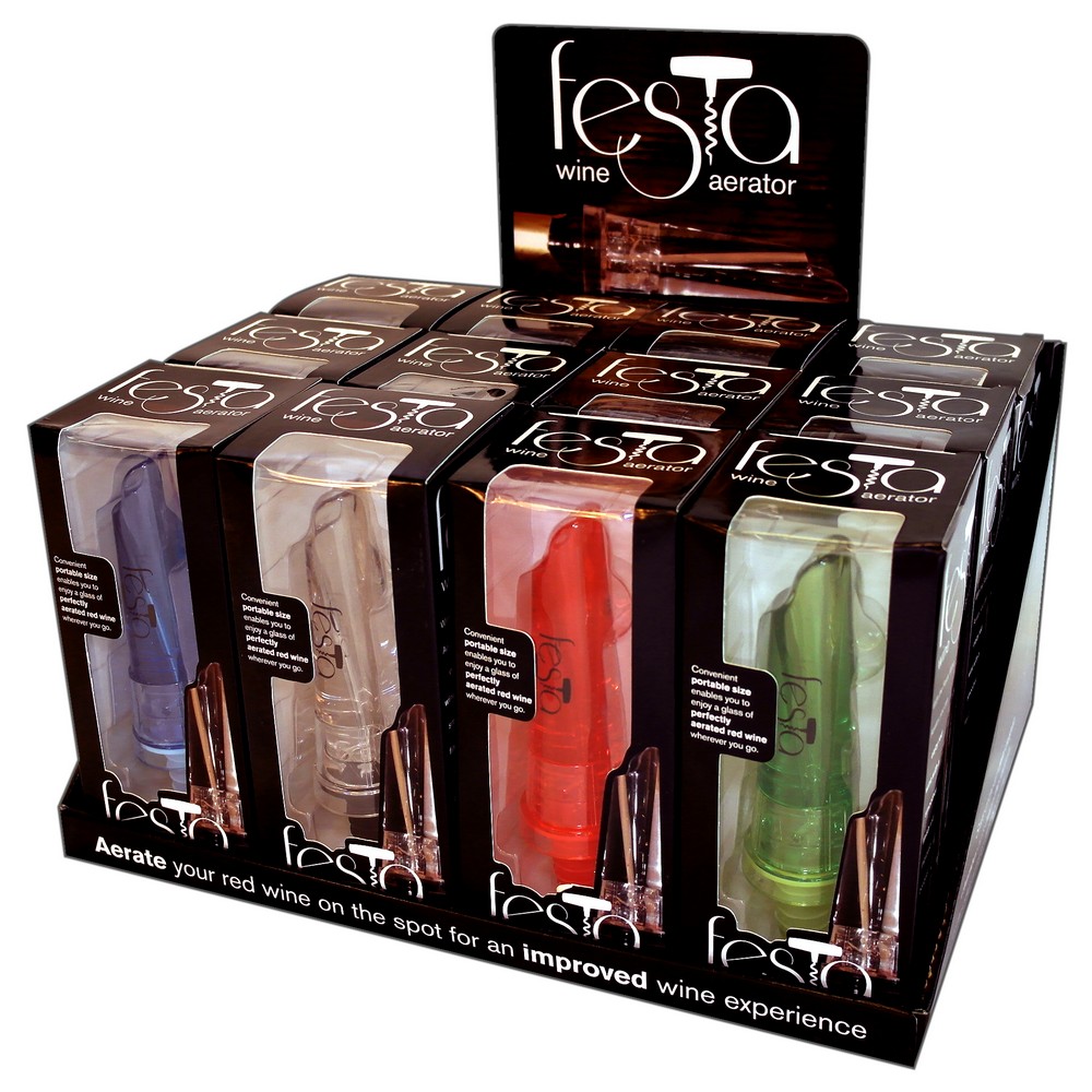 DescriptionReviews Description Festa Aerator PDQ containes 4 Clear, 2 Each of Red, Blue, Purple and Green. There are on bottle wine aerators. Reviews Be the first to review this item There are no reviews yet Skip list Product tags Customizable 218 Wine 3591