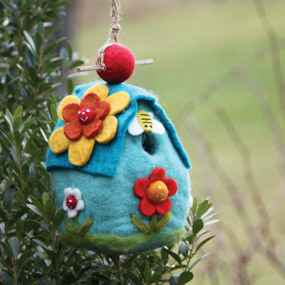Yes! This hand felted wool Bird House can be hung outside as well as inside, and yes, small birds like wren, chickadees, nuthatch and titmouse may go inside! The 1 1/4 inch hole is sized for use by small birds but can be enlarged to 1 1/2 inch to appeal to larger birds such Bluebirds and Tree Swallows. Birds might also pull at the wool to use in making their own nests. Hang one up and see what happens! The body is made of 100 percent naturally water repellent wool and rarely gets wet inside. Surface moisture from dew, rain or snow quickly dries in the open air. Wool is also naturally dirt and mold resistant. Generally, a good brushing is all that's needed. Otherwise, work the spot with mild soapy water, then rinse and air-dry. Do not use a washing machine or dryer. Will last forever in a protected place such as a porch or inside where its highly decorative qualities are sure to bring a smile to everyone. Use it as a door greeter, a porch ornament, or to enliven a kitchen, bath or bedroom! If placed in direct sun colors will begin to fade within a month as with any dyed fabric, but the opening and body will keep its shape in even the hardest weather. Made with sustainably harvested materials including wool, hemp for the hanging cord and a bamboo perch. Hand crafted by skilled artisans working in a fair trade production center in Kathmandu, Nepal. Comes lightly packed with shredded recycled paper to maintain shape. Remove when ready to use. Also includes a clean out door at the bottom.