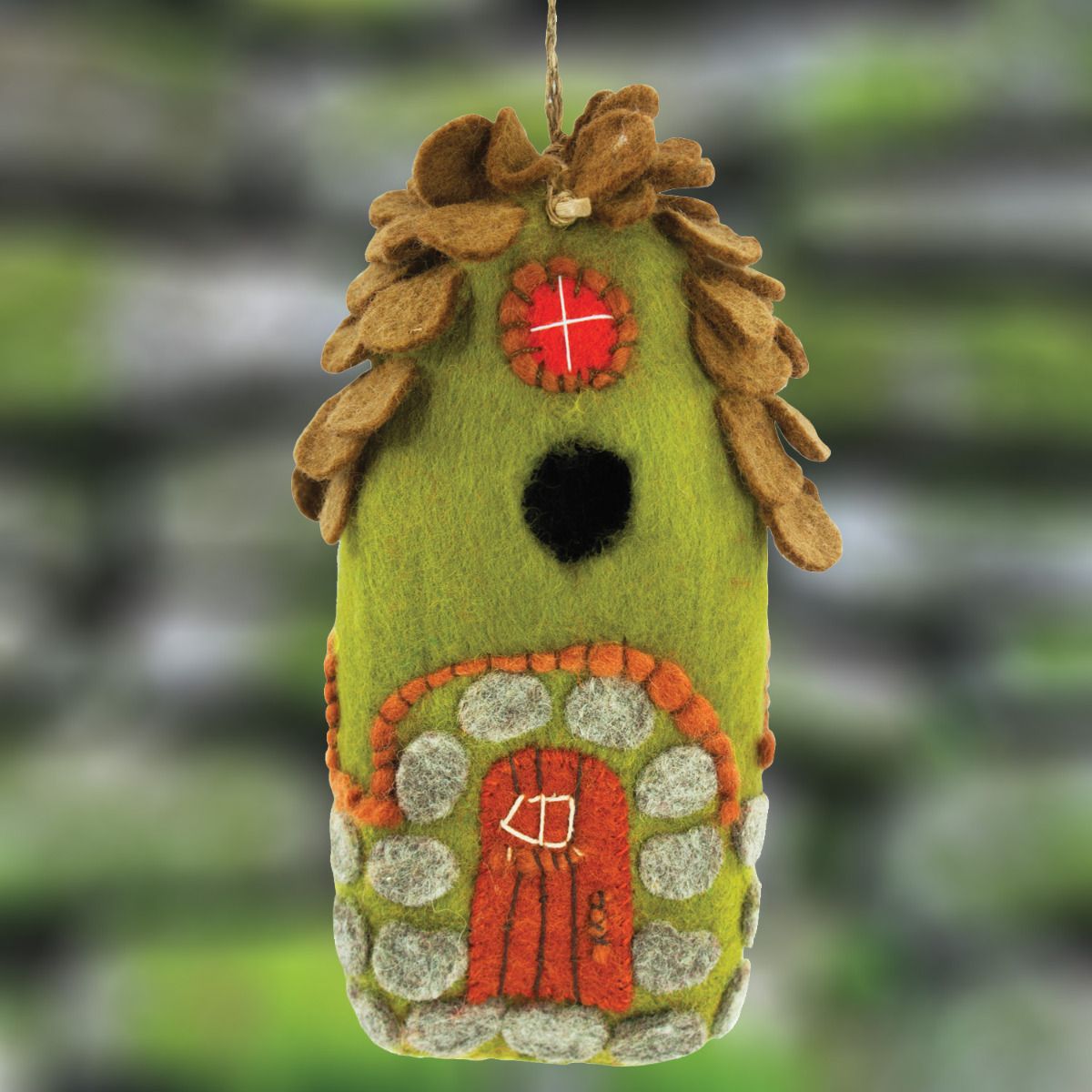 Yes! It can be hung outside as well as inside, and yes, small birds like wren, chickadees, nuthatch and titmouse will go inside! Made of 100% naturally water repellant wool, so when it does get wet on the surface it dries out fairly quickly. Wool is also naturally dirt and mold resistant. Birds might pull at the wool to use in making their own nests. Hang one up and see what happens! Colors will fade in direct sun after a few months, but the body will keep its shape in even the hardest weather. Will last forever in a protected place such as a porch or inside where its highly decorative qualities are sure to bring a smile to everyone. Use it as a door greeter, a porch ornament, or even to enliven a kitchen, bath or bedroom! Made with other sustainably harvested materials including a hemp hanging cord and bamboo perch. Handmade by skilled artisans working in a fair trade production center in Kathmandu, Nepal.