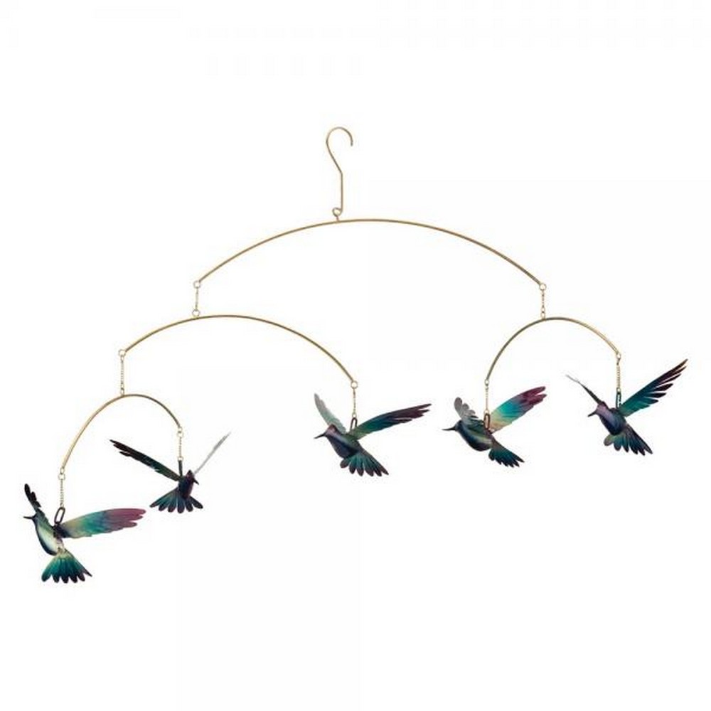Mobiles are soothing relaxing and tranquil as they softly move and float in space providing visual stimulation. Painted in purple gold rainbow finish on 3D Hummingbird. No assembly required elegantly balanced and easy to hang on a tree pergola or a shepherd's hook