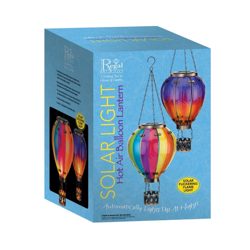 Beautifully hand-painted multi-colored glass work in the most popular hot air balloon colors. Special flickering LED solar lights create the appearance of flames shooting up from the burner engine in a real hot air balloon. Truly an eye catching addition to any garden hanging on a tree| shephers hook or a pergola. Create a Uses solar panel 2V 100mAh using Ni-MH AAA 600mAh 1.2V battery