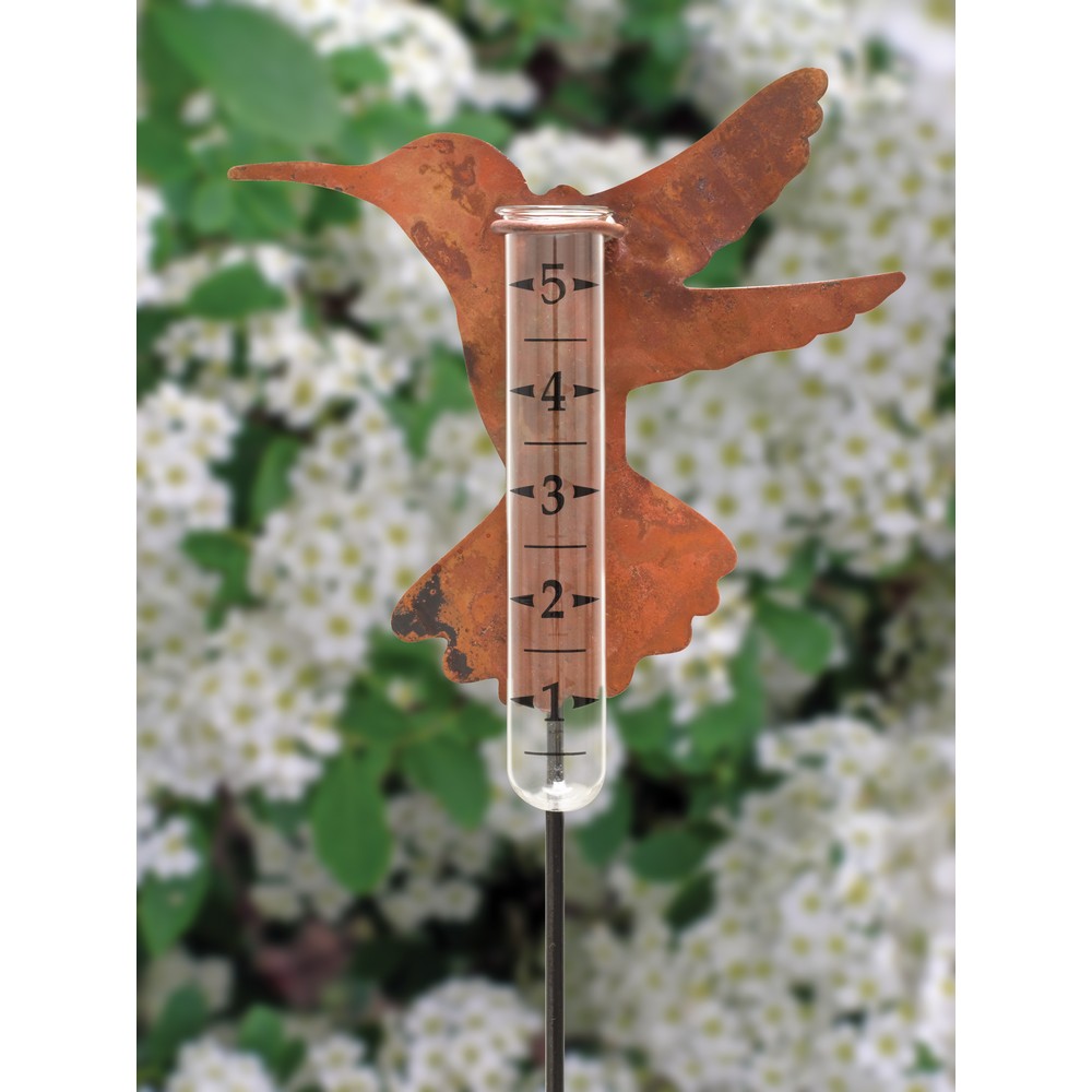 Hummingbird Rain Gauge. Building on the popularity of our best selling Nature Thermometers, we bring the warmth of flamed copper to rain gauges. They will provide your greenspace with both charm and a practical means to measure the day's rain-fall. Two piece Rain Gauge 15 in tall. Gift Boxed. Rain gauge alone measures 6 inches long inside diameter of rain gauge is 7/8 inch and the outside lip diameter is 1.25 inch.