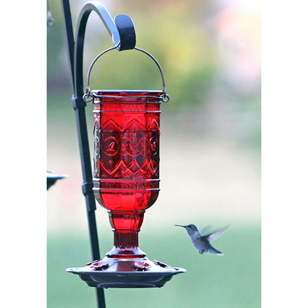 Antique style feeder with stunning 8 sided glass bottle comes in two beautiful colors; Red or Amethyst. The Feeder has 5 integrated metal flower ports and wide mouth design bottle for Easy-Fill and Easy Clean. The base disassembles for cleaning to reduce or eliminate spillage. Holds 20oz of nectar.