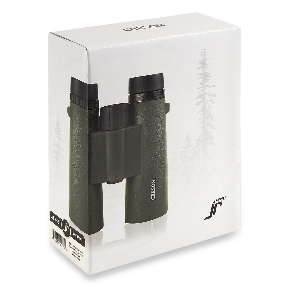 The JR Series full sized binoculars from Carson feature a close-focus and waterproof design. They are available in both 8x42mm (JR-842) and 10x42mm (JR-042) sizes. The JR Series binoculars contain BAK-4 prisms and fully multi-coated optics for extremely sharp and crisp image quality. They are both o-ring sealed and nitrogen purged making them both waterproof and fogproof. Superior close-focus capabilities allow you to focus on objects as close as 20 feet in front of you. The large objective lenses allow for greater light gathering capabilities even in low-light conditions. These are perfect binoculars for bird watching, hunting, sight-seeing, surveillance, camping, concerts, safaris, sporting events, travel and other outdoor adventures. The JR Series binoculars come included with a protective pouch, neck strap, lens covers and a lens cloth. They are also tripod mountable. At Carson, we manufacture only the highest quality binoculars. We're so confident in our products that we back them with a No Fault. In the event that your binoculars get damaged, regardless of cause, Carson will repair or replace them for a total cost of $15.00, which includes all return shipping and handling fees. NO HIDDEN CHARGES! If your binoculars are found to have manufacturing defects in materials or workmanship, Carson will repair or replace your binoculars and return them FREE OF CHARGE.