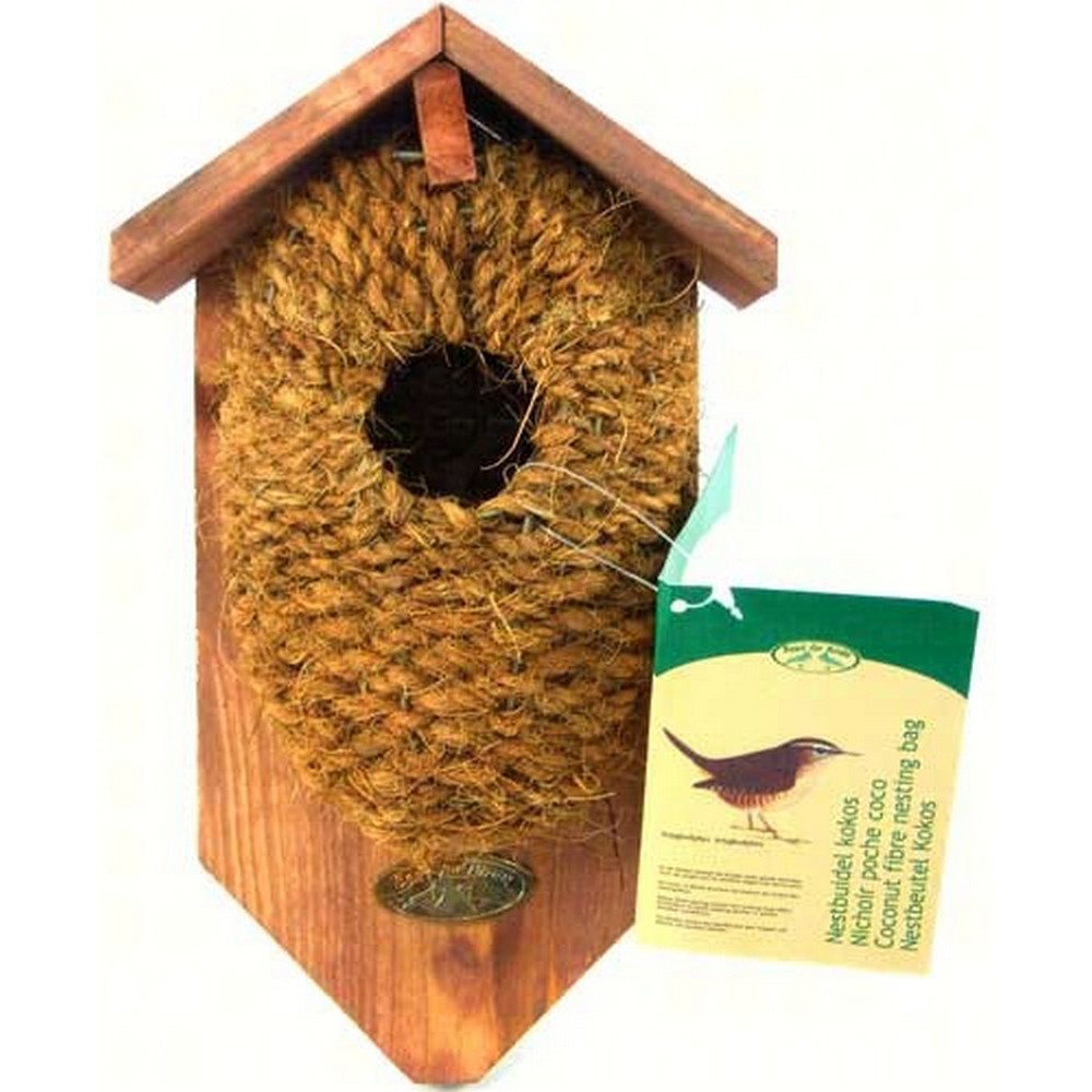 Nest Pocket Coconut Fiber with roof. This nesting bag has been designed for the wren. The best place to hang the nesting bag is a quiet and somewhat sheltered spot, therefore not in the direct sunlight or on the side catching the rain, and an obstacle-free approach route for the bird. Fall is the best season to clean out the nesting bag. Many times during winter the nesting bag offers protection to birds seeking shelter in severe weather conditions.