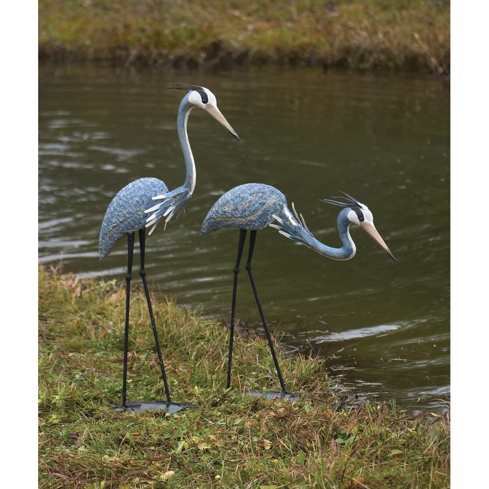 Everyone loves to watch graceful herons. This pair with one bowing and one with a stretched neck will look right at home in any yard or garden. The heron are sprayed with a powder coated finish. If displayed outdoors, it is suggested that a coating of polyurethane be reapplied from time to time. The standing heron is 17 inches wide by 32 inches high. The bowing heron is 32 inches wide by 23 inches high.