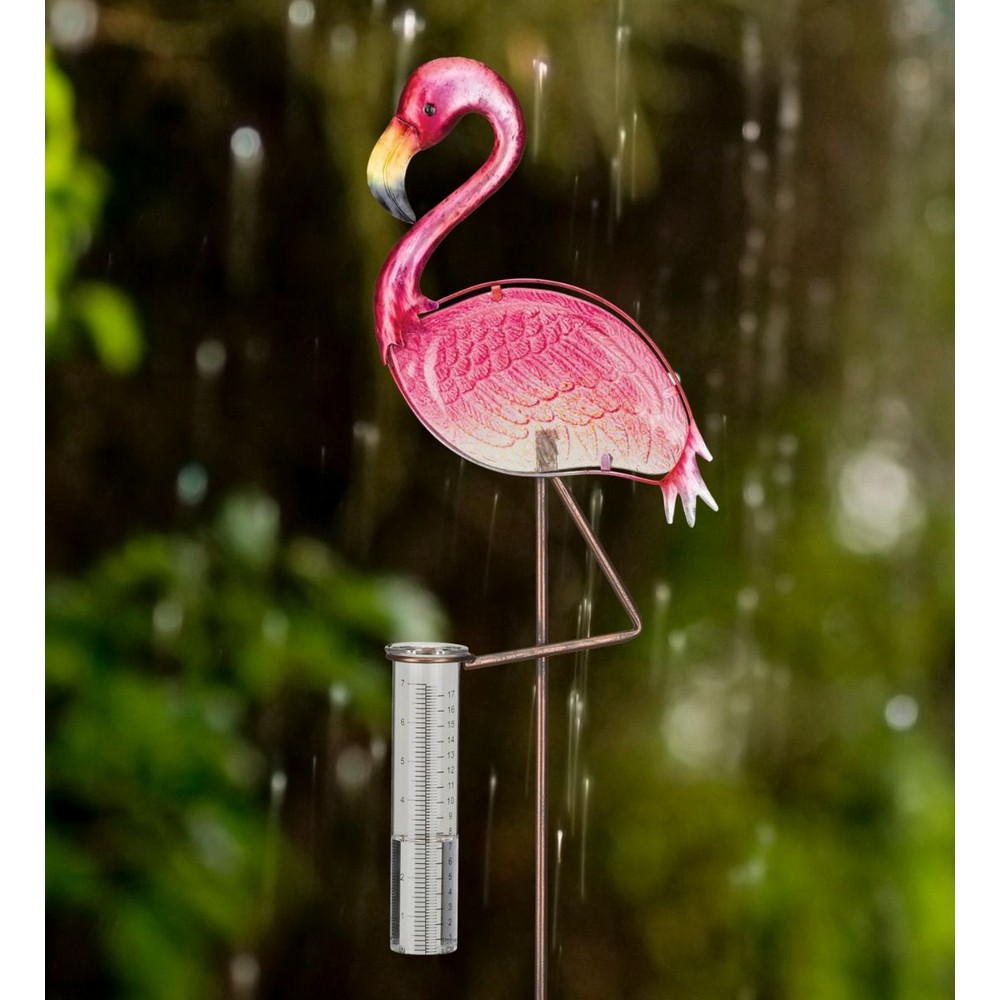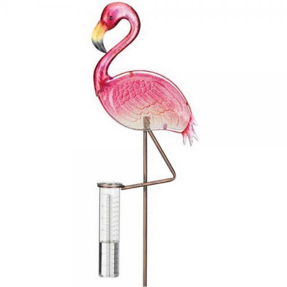 Features a metal head and neck painted with iridescent accents as well as a hand-painted glass body embossed with feathered wing detail. Gauge comes with a large, easy to read glass tube that has measurements in both inches and millimeters. Comes with a two-prong fork to secure it to the ground