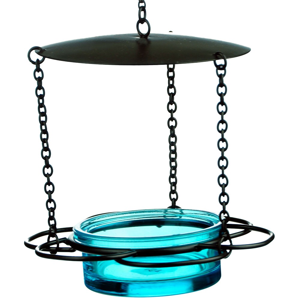 3.4 Ounce Capacity accommodates several birds at once. Open Top hook With Metal Chain allows for easy hanging. Petal-Shaped Wire Perch provides resting spot for birds and longer viewing enjoyment. Detached Glass Bowl supports quick and easy hand cleaning. Recycled Glass & Powder Coated Metal Construction makes for an eco-friendly and longer lasting feeder.