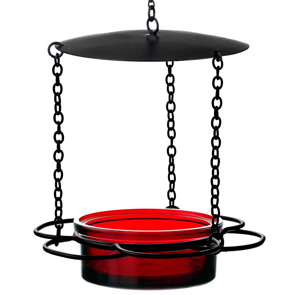 3.4 Ounce Capacity accommodates several birds at once. Open Top hook With Metal Chain allows for easy hanging. Petal-Shaped Wire Perch provides resting spot for birds and longer viewing enjoyment. Detached Glass Bowl supports quick and easy hand cleaning. Recycled Glass & Powder Coated Metal Construction makes for an eco-friendly and longer lasting feeder.