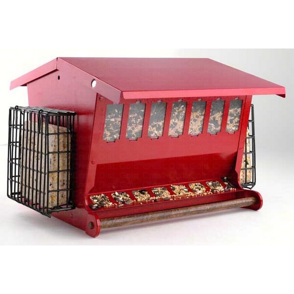 Seed 'n More Feeder. Two side suet baskets feature snap on latch for easy filling. Hefty feeder holds 15lbs (2.5 gallons) of seed. Double sided to draw more birds. Easy to fill and clean. No Waste seed saver baffle. Durable, chew resistant powder coated steel body. Metal perch.