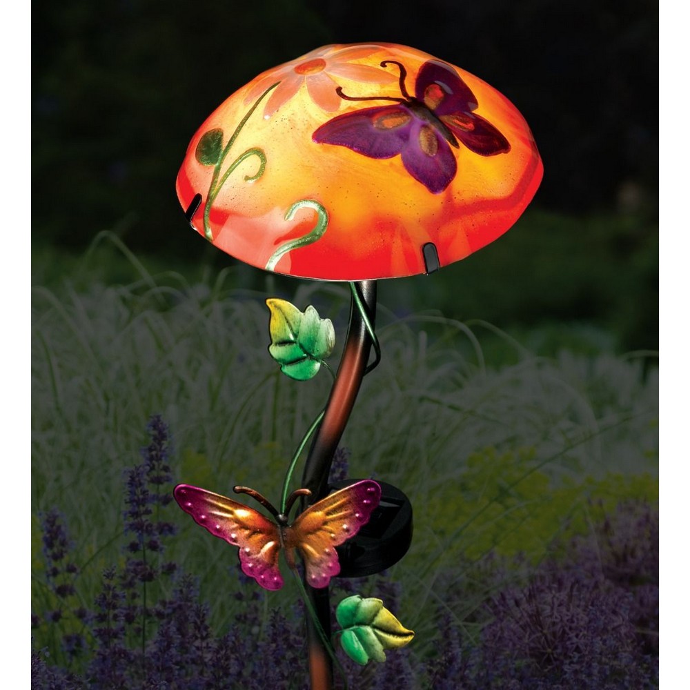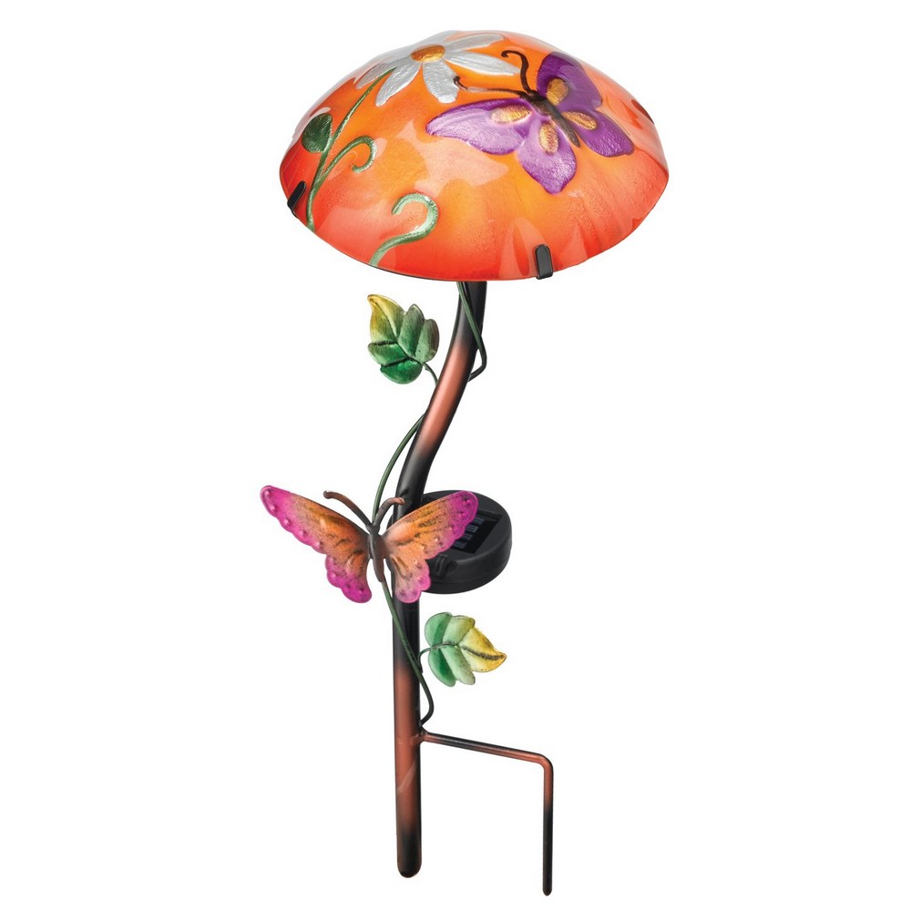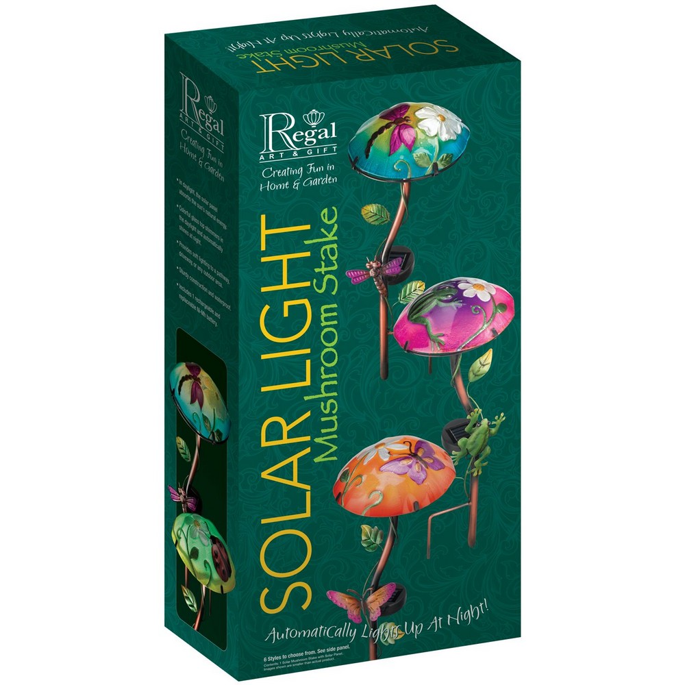 Light up outdoor gardens with this durable glass Solar Light Mushroom Stake. Gorgeous color and hand-painted design can be enjoyed during the day. The inner cap of the mushroom is sealed with an pearl paint that enables the energy saving solar powered LED light to softly illuminate pathways, driveways or any outdoor area at night.