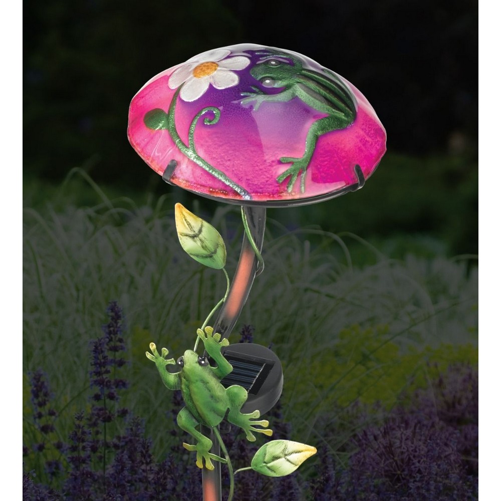 Light up outdoor gardens with this durable glass Solar Light Mushroom Stake. Gorgeous color and hand-painted design can be enjoyed during the day. The inner cap of the mushroom is sealed with an pearl paint that enables the energy saving solar powered LED light to softly illuminate pathways, driveways or any outdoor area at night.