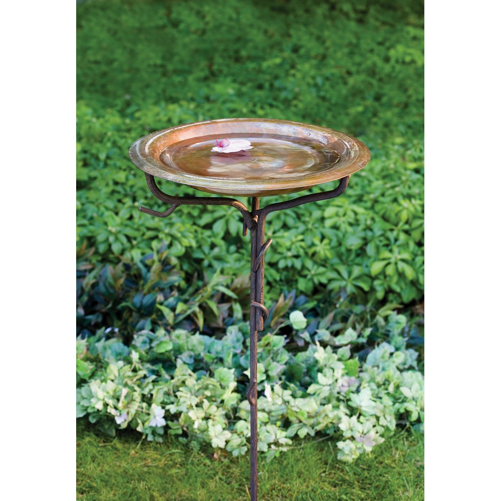 Solid copper birdbath with Twig-like base (KD). The actual measurements of the bird bath are 14.5 x 14.5 inches. The stand is 36 inches high and 12.5 inches in diameter. Must charge additional freight (applies to Brick and Mortar stores only).