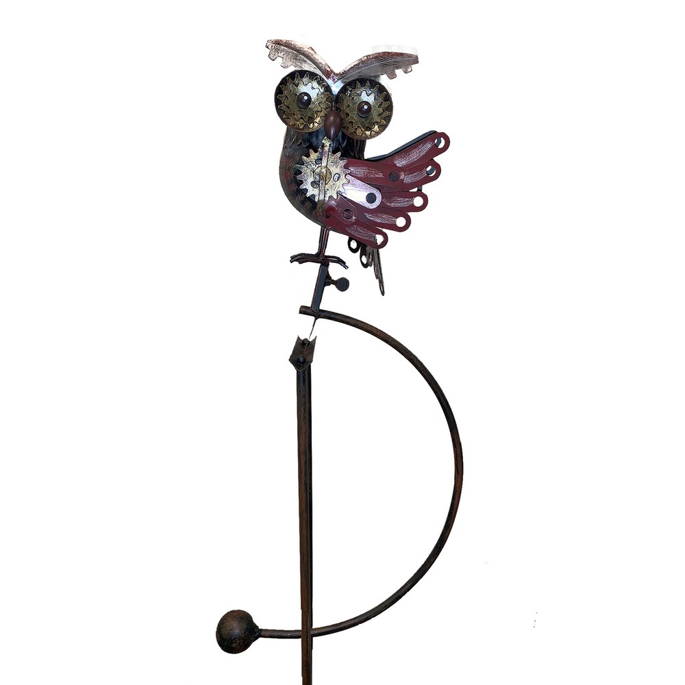 Display your love of wind power, machinery, and wildlife at once by placing this Staked Metal Mechanical Alert Owl Rocker in your yard. Adding a balancer to your landscaping brings striking movement to the setting easily, and the deep colors on this piece enhance any flowerbed. A variety of gold colored gear shapes form the eyes and shoulders of this owl figure, contrasted by a silver, pronounced brow. Brown discs behind and orbs in front of the gold gears create an intent expression on the bird, while a matching, metal oval between them evokes a beak. Additional steel and metal straps form the tail and wing feathers, each with a hole on the end for a light effect. Red, silver, rust, and deep brown hues throughout the bird lend extra dimension to your landscaping, and thin legs and detailed feet perch on a bottom beam. A striking, all metal stake wonderfully supports the owl figure, with an open section near the top accommodating the bottom counterweight. The "V" shaped top channel allows the forked base of the topper to balance beautifully, and a 4.75" long, step-in base offers extra stability. Thumbscrew connections on the stake and bird topper allow you to disassemble the item for storage or maintenance, and the metal and steel construction lasts for seasons of service. Bring your love of birds and building materials to your yard with this Staked Metal Mechanical Alert Owl Rocker. Some assembly required.
