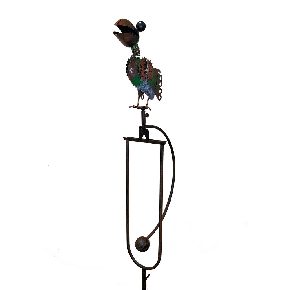 Brightly accent your garden with color and movement using this Staked Metal Mechanical Toucan Rocker. Adding this intricate unit to your landscaping wonderfully captures attention, and appears to turn found objects into striking, functional art. Oblong, slightly domed metal panels join in the center to create the bird's body, with gear shapes on two sides holding the wing figures. A silver colored arrow atop the dual, copper colored gears enhances their bright appeal, and contrasts the green and red tones on the body. A spring forms the bird's neck, supporting its head and two raised orbs for eyes. The significant, copper colored, open beak adds a bit of personality to the bird, and matches its legs, feet, and shoulder gears. A metal, semicircular rod with bottom orb supports the ornate figure, and the forked base of this assembly rests on the top, "V" shaped channel of the included stake. An opening beneath this channel provides clearance for the arced rod and counterweight, so you can enjoy the lasting, gentle movement of the figure. Use the thumbscrew to secure this top section of the support to the bottom shaft, and insert its 5" long, step-in base into soil for added stability. The brown hue on the stake enhances the natural world, and allows the green, red, gray, and copper colors on the topper to shine. Crafted from lasting metal, this item will remain usable and vivid for several seasons, and also disassembles easily for storage. Place this Staked Metal Mechanical Toucan Rocker in your garden for a fantastic, moving element that all visitors can enjoy. Some assembly required.