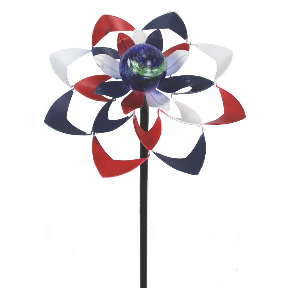The Stars and Stripes Pinwheel is a unique and delicate touch of metal garden art to any outdoor setting The Illuminarie 2.5” Glass globe is adorned with glow crystals on the interior surface creating a "Glow in the Dark" beauty to light up your garden. This is known as passive-solar and is a zero-waste process as there are no batteries to replace. All metal parts of this garden accessory contain an applied finish to help brave the elements and prevent premature rusting.