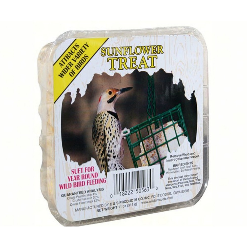 Sunflower Treat is made of beef suet, sunflower hearts, millet & corn that attracts a wider variety of birds for your year round wild bird feeding. Ingredients: Rendered Beef Suet, Sunflower Hearts, White Millet, and Corn. Additional freight applies when shipped.
