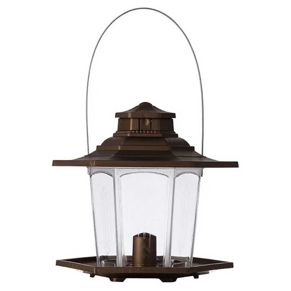 The small plastic lantern feeder features a Pop top for easy filling. Traditional six sided lantern with beautiful frosted plastic sides and bayonet lock for basin for easy cleaning. Features an integral Perch in basin with drainage holes and a pole mounting option that will mount to 1"" wide poles. Holds 2.6 lbs. of seed.