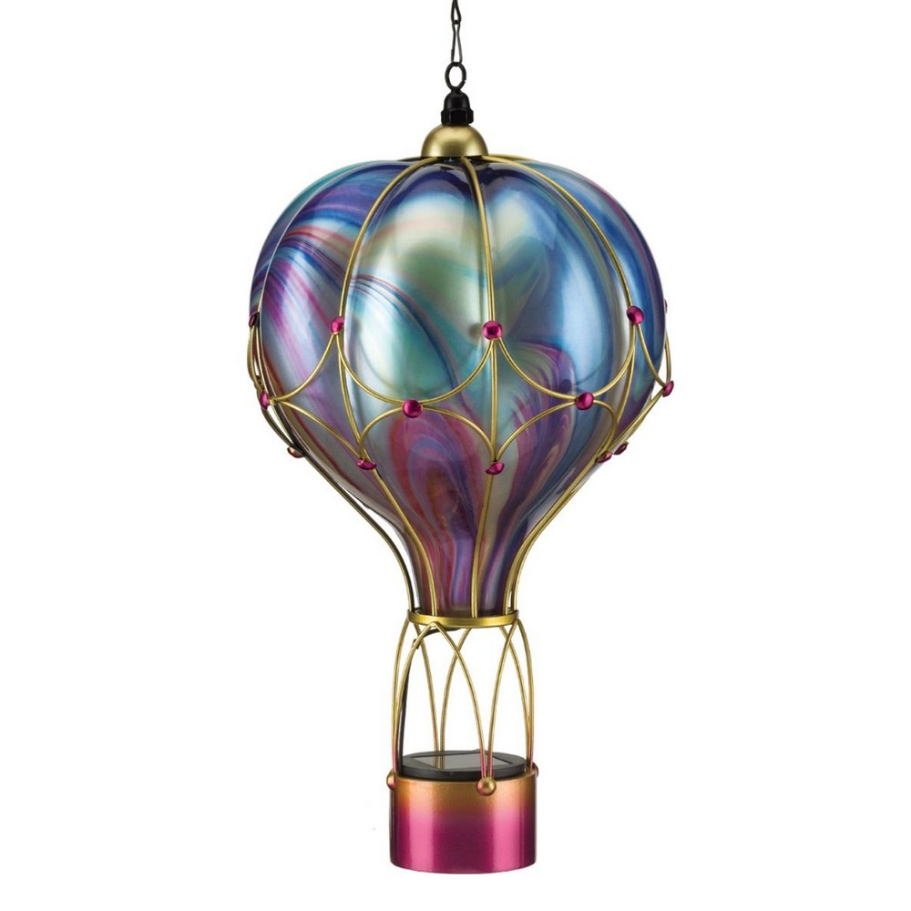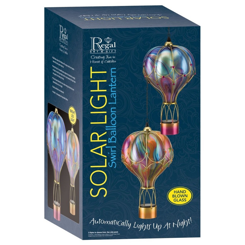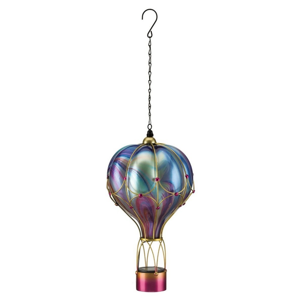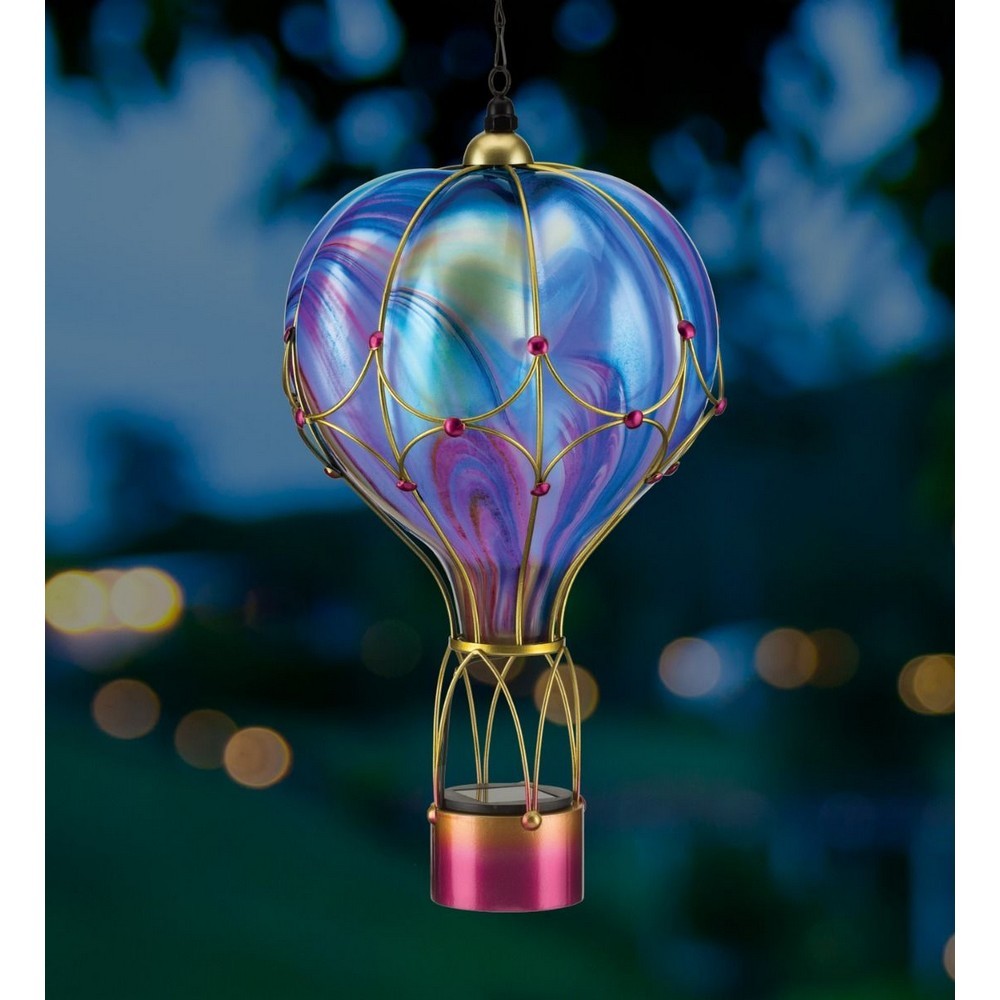 and blown glass Hot Air Balloons with a unique colorful swirl pattern makes these Solar Lanterns stand out. During the day they are beautiful glass sculptures that catch the sunlight. At night the colorful glass lights up from a solar powered LED light inside and appear to be floating in the sky.