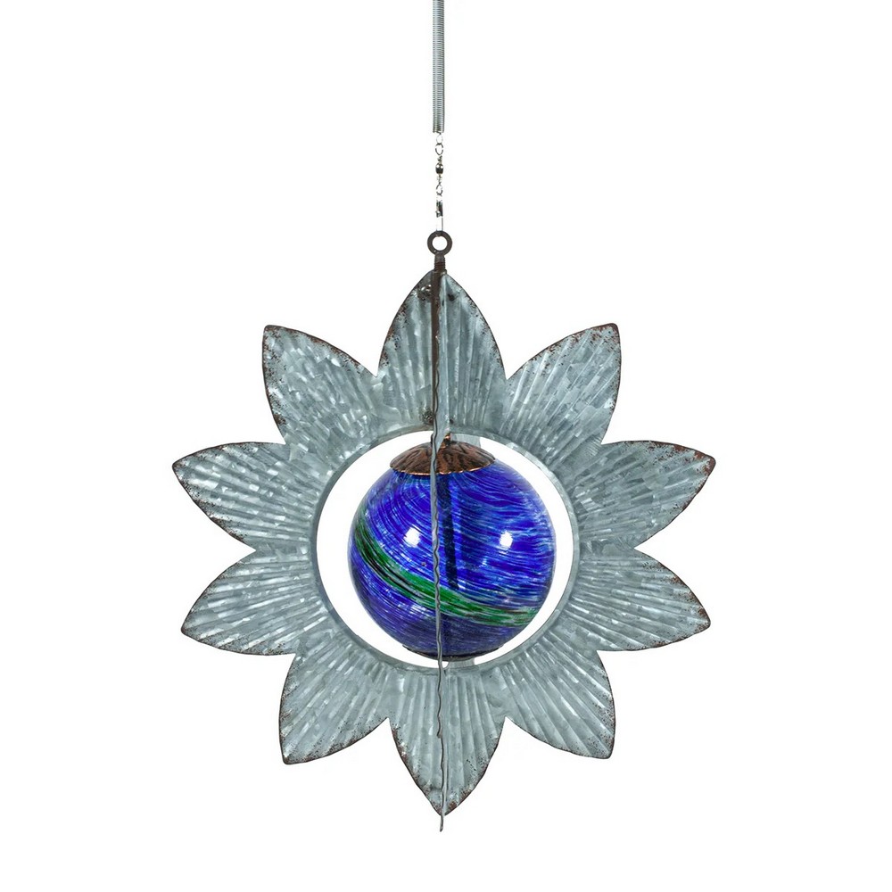 DescriptionReviews Description A galvanized metal hanging spinner with a sun silhouette. The interior 4 inch glass globe is glow-in-the-dark thanks to its luminescent glow crystals. Reviews Be the first to review this item There are no reviews yet