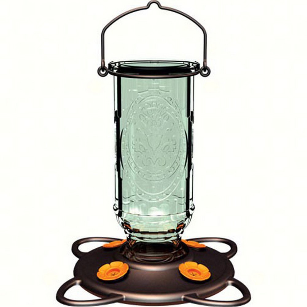 Large capacity beautiful Vintage bottle with pewter metal accents. Stands flat on counter for easy filling. 4 highly durable integral metal Oriole perches. Patented Nectarguard bee guard ports integrated into the basin keep bees out! Holds 20 oz of nectar.