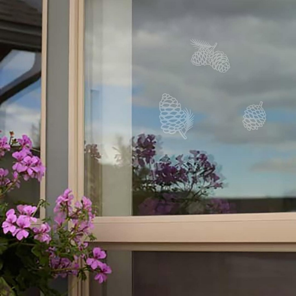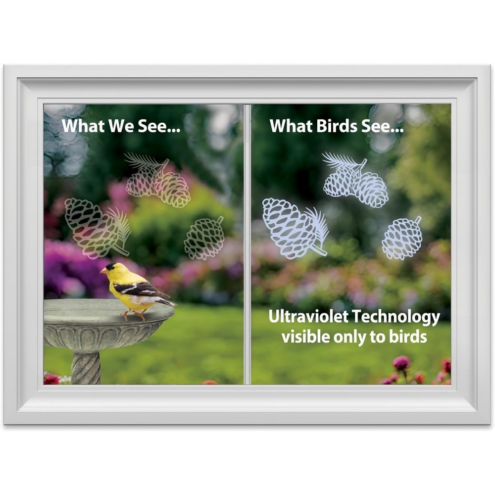 WindowAlert decals help prevent wild birds from accidentally striking windows. Each decal has a special coating that reflects ultraviolet sunlight. This ultraviolet light is invisible to humans, but birds see it as a brilliant glow much like a stoplight. To the human eye, the decals appear as frosted or etched glass.