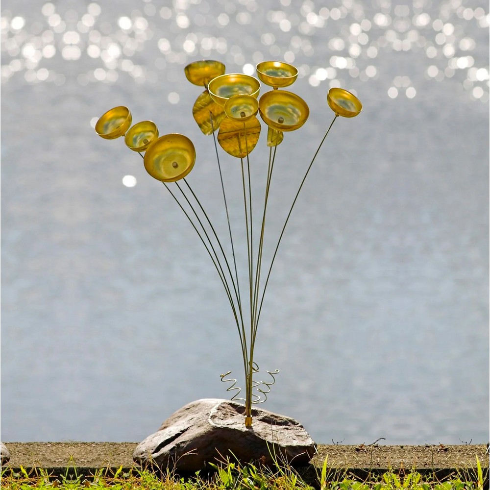 Woodstock Garden Bells are a unique sculpture designed to add beauty and charm to the home or garden. Adapted from an original design by artist and musician Ron Snider, they are handcrafted using solid brass bells for excellent sound. Woodstock Garden Bells feature nine beautiful brass cups on long wire stems mounted to a weather-resistant GardenStone base. Place your Garden Bells on a walkway and your guests won't be able to resist announcing their arrival by ringing these bells. Of course, this bouquet of brass cups is just as beautiful when placed inside too, where the lightest touch will create soft and soothing music.